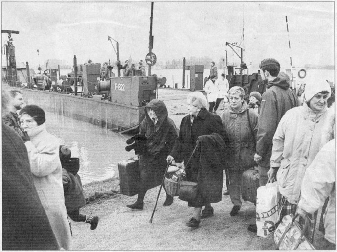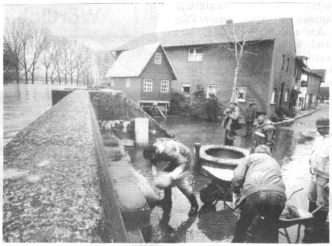 ... Für den Ernstfall steht die Bundewehr im Kreis Kleve mit 350 Mann, 50 Fahrzeugen und Bussen bereit. Auf Salmorth und bei Rees evakuierten die Emmericher Pioniere das Vieh von eingeschlossenen Höfen. Gestern holten sie auch Frauen und Kinder vom Ort Schenkenschanz. Etwa 30 Männer blieben auf der Insel zurück. Wenn der Deich bricht, stehen Hubschrauber und ein AWACS-Aufklärungsflugzeug zur Verfügung. Bei der Polizei gib's Urlaubsperre und Unterstützung durch 20 zusätzliche Beamte. Sie regeln den Verkehr und sollen Plünderungen verhindern. Bricht der Deich, dann stehen weitere Hundertschaften bereit. ...