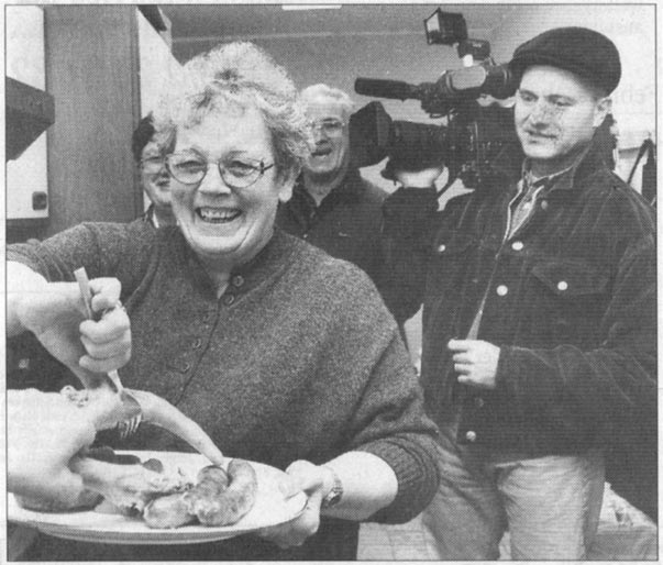 »Geschlafen haben wir in den vewrgangenen Nächten nicht. Ich habe lediglich stundenweise auf der Couch geruht«, sagt Manfred Schimmler. [Berichtigung von mir: Hier muss es heißen Manfred Schirmel.] Zu den Junioren der Truppe, die Brandmeister Heiner Evers von der Freiwilligen Feuerwehr eingesetzt wird, gehört der 19jährige Holger Beem. »Natürlich vermißt er seine Mutter und seine Schwester, schließlich muß er jetzt den Abwasch machen«, lacht Vater Jürgen. Dessen Frau Elvira und seine Tochter Christiane sind auf dem sicheren Festland bei Kleve untergebracht. Gegen die Isolierung von der Außenwelt haben die Frauen ihre Männer gut vorbereitet: mit gefüllten Gefriertruhen, in denen auch die Frühstücksbrötchen liegen. Selbstverständlich seien sie besorgt gewesen, »aber in die Hosen haben wir uns nicht gemacht«, schildert Paul Schweers, die Situation bei den selbstbewußten »Schänzern«.